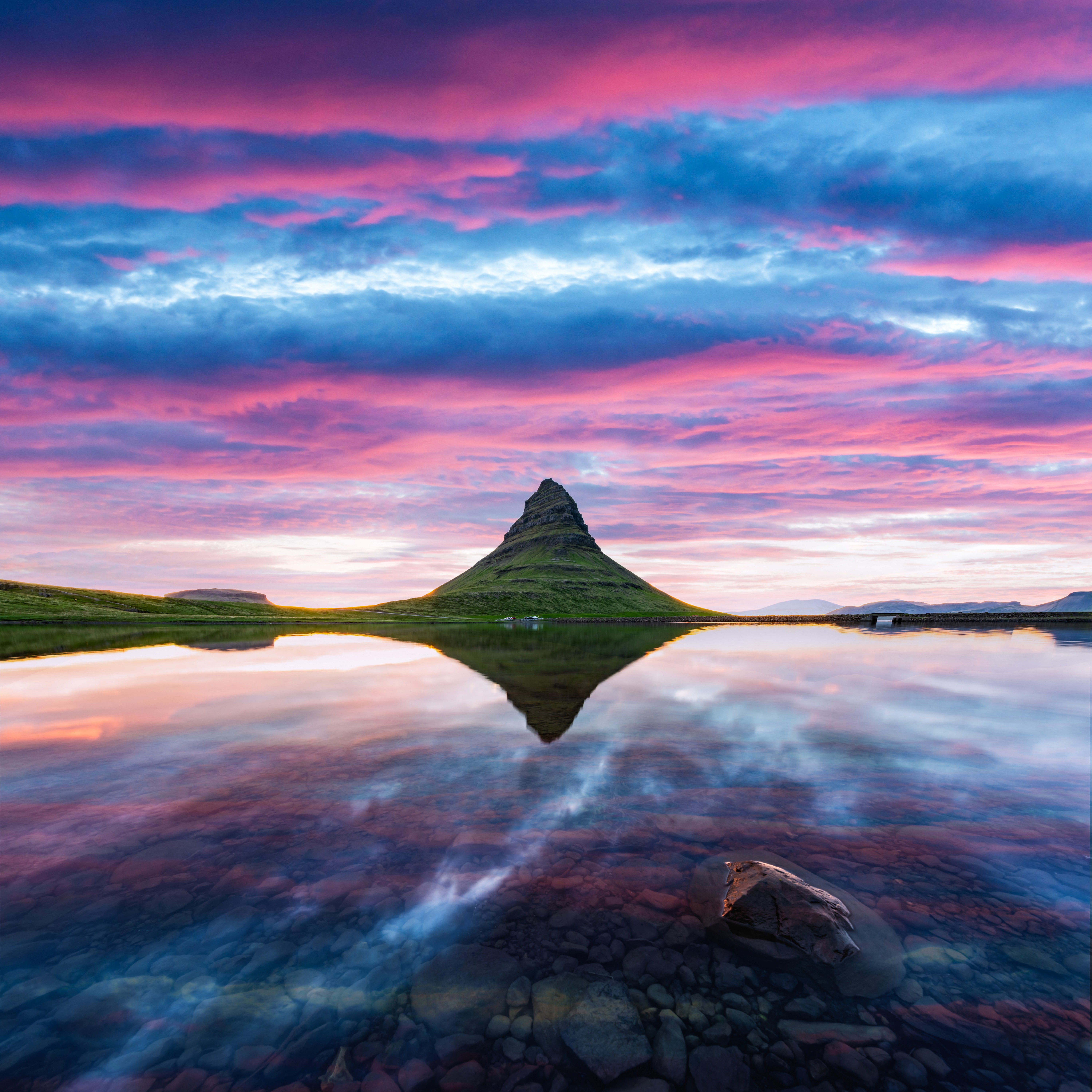 Kirkjufell Mountain and Kirkjufellsfoss: This steeple-shaped peak is one of Iceland’s most photographed mountains, beautifully paired with the nearby Kirkjufellsfoss waterfall.